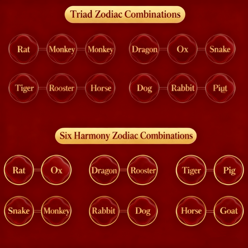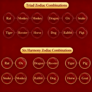 Rat /Dragon /Monkey, Ox /Snake /Rooster, Tiger /Horse /Dog, Rabbit /Goat /Pig |